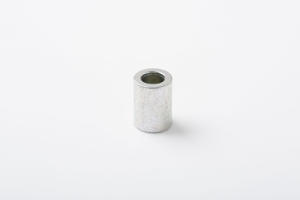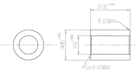上記の製品は、長さ方向19.35mmに対して、±0.05mmの寸法精度が求められている樹脂部品へのインサートカラーです。月産30万個の量産品となっています。直径方向に寸法公差±2/100mmの指定があり、従来は切削により加工を行っていました。しかし、ロット数の増加に伴い、冷間鍛造+切削による加工が検討されていましたが、それでも想定するコストに届かず、当社に問い合わせをいただきました。