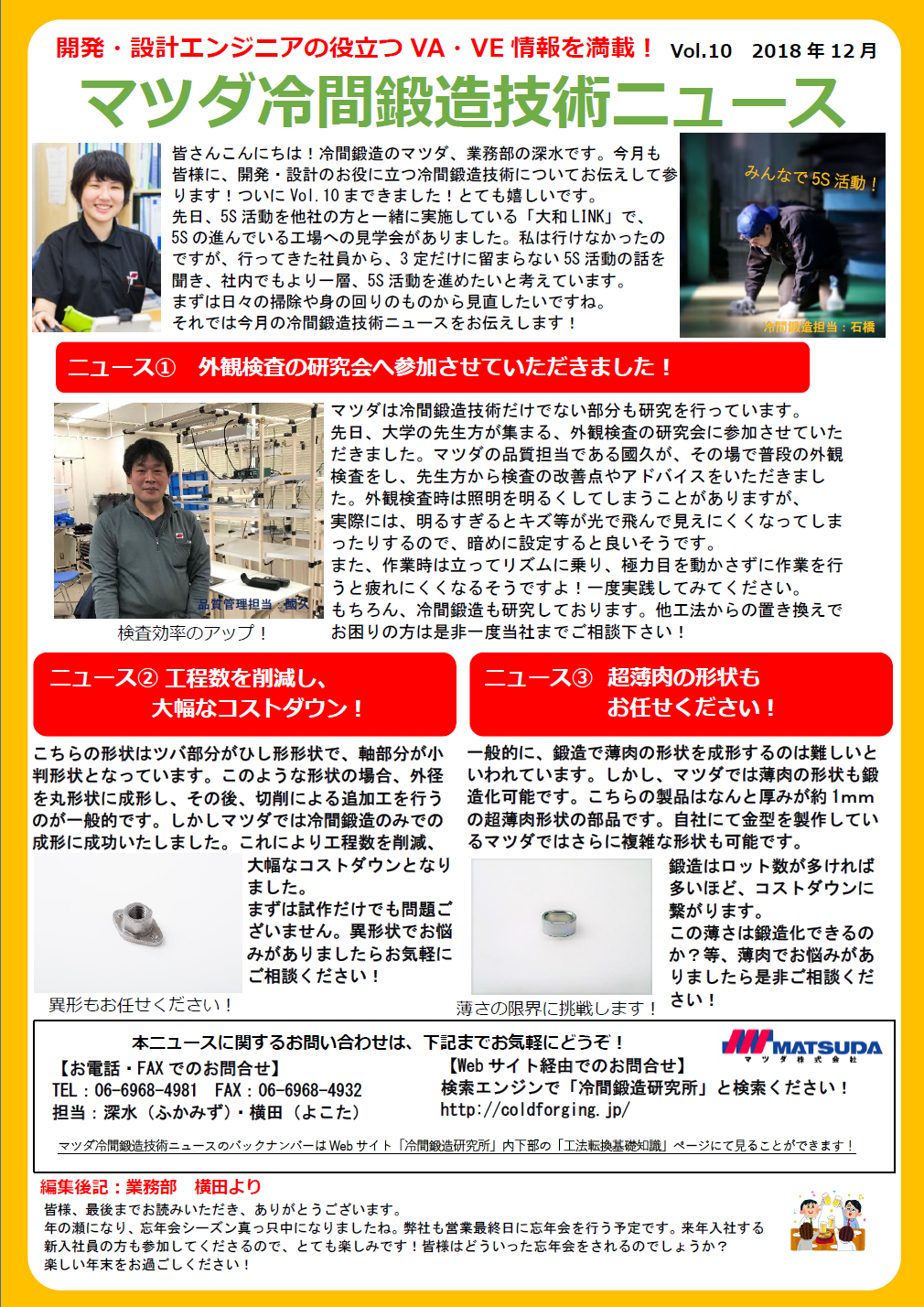 マツダ冷間鍛造技術ニュース 2018年12月号 マツダ冷間鍛造技術ニュース 2018年12月号! 記念すべきVol.10となりました! 今月のテーマは、冷間鍛造研究所での加工事例と外観検査についてです 1)外観検査の研究会へ参加させていただきました! 2)工程数を削減し、大幅なコストダウン! 3)超薄肉の形状もお任せください! ダウンロードは画像をクリック!! 毎月掲載をしていきます!来月もお楽しみに!!