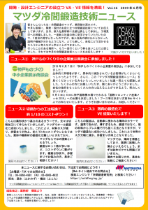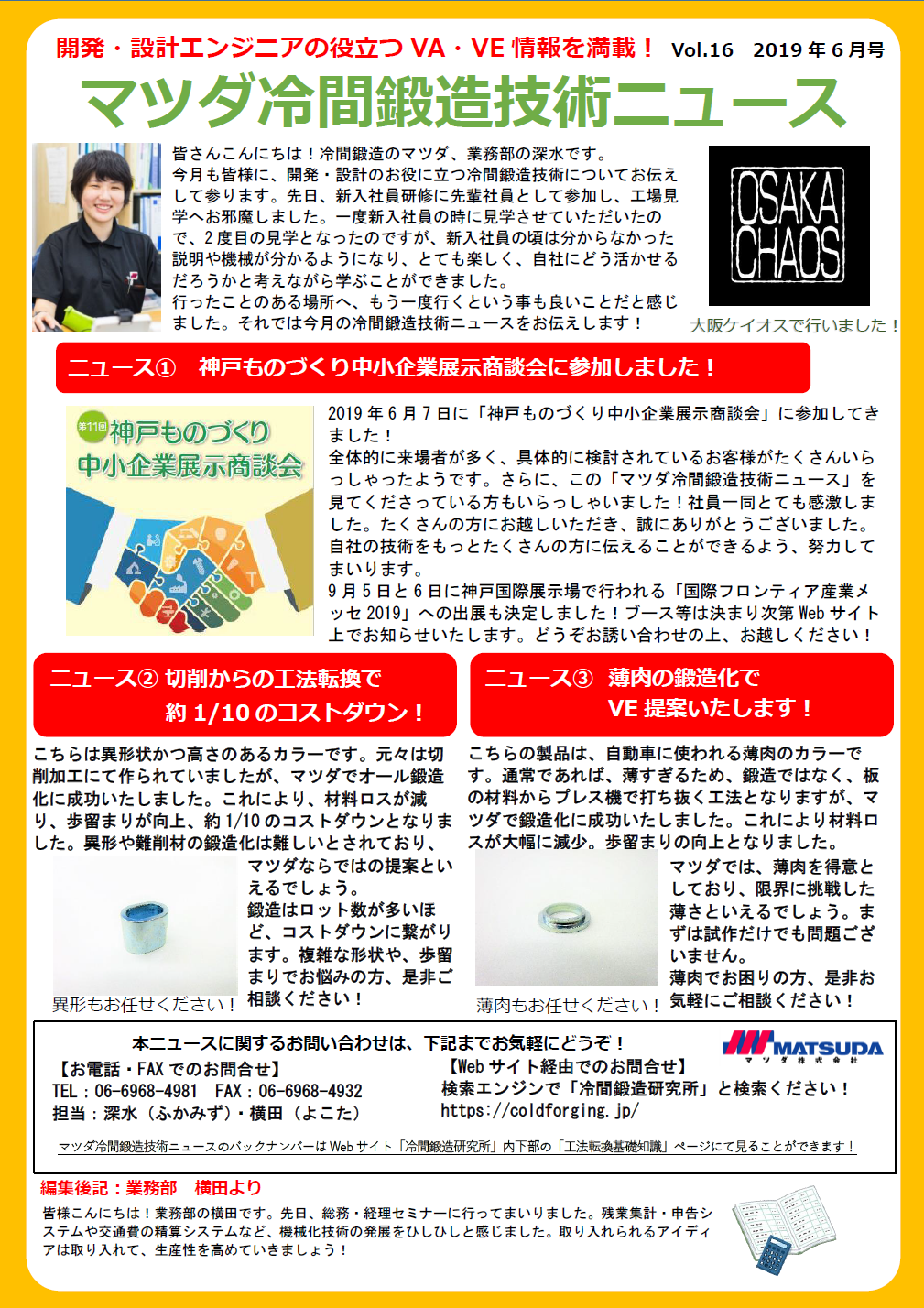 マツダ冷間鍛造技術ニュース 2019年6月号 マツダ冷間鍛造技術ニュース 2019年6月号! 皆さんこんにちは! 今月も皆様のお役に立つ冷間鍛造技術についてお伝えします! 今月のテーマは、展示商談会・製品事例についてです! 1)神戸ものづくり中小企業展示商談会に参加しました! 2)切削からの工法転換で約1/10のコストダウン! 3)薄肉の鍛造化でVE提案いたします! ダウンロードは画像をクリック!! 毎月掲載をしていきます!来月もお楽しみに!!