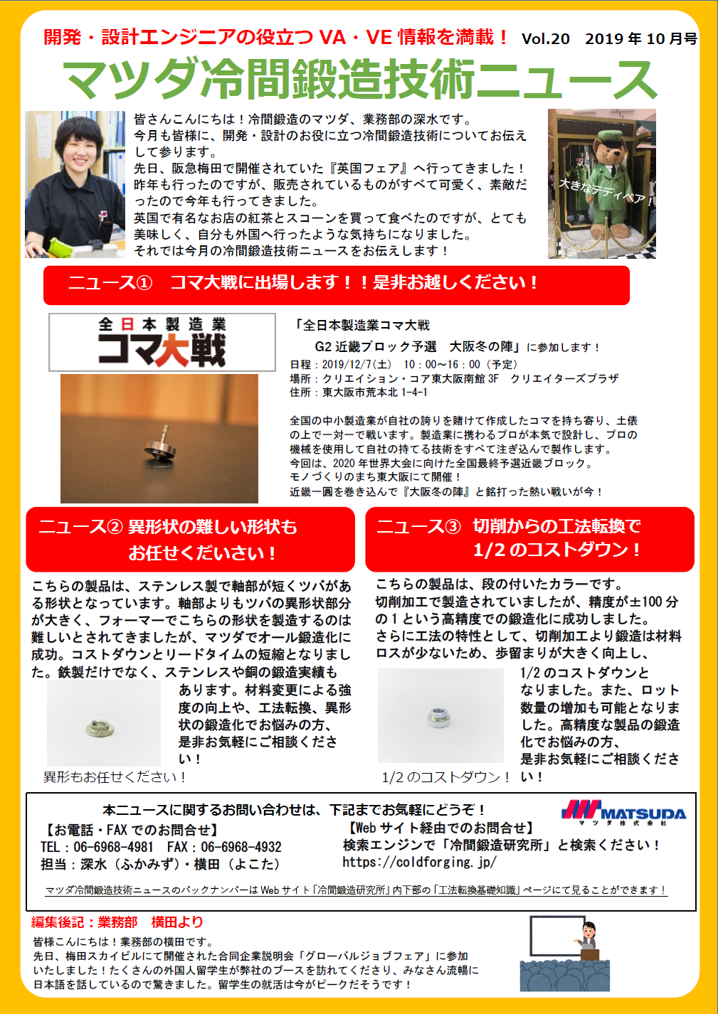 マツダ冷間鍛造技術ニュース 2019年10月号 マツダ冷間鍛造技術ニュース 2019年10月号! 皆さんこんにちは! 体調は崩されてないでしょうか! 今月も皆様のお役に立つ冷間鍛造技術についてお伝えします! 今月のテーマは、製品事例についてです! 1)コマ大戦に出場します!!是非お越しください! 2)異形状の難しい形状もお任せください! 3)切削からの工法転換で1/2のコストダウン! ダウンロードは画像をクリック!! 毎月掲載をしていきます!来月もお楽しみに!!